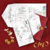 – Tờ báo hỷ: 12cm x18cm….(option), in 2 mặt – giấy mỹ thuật tiêu chuẩn định lượng 250gsm