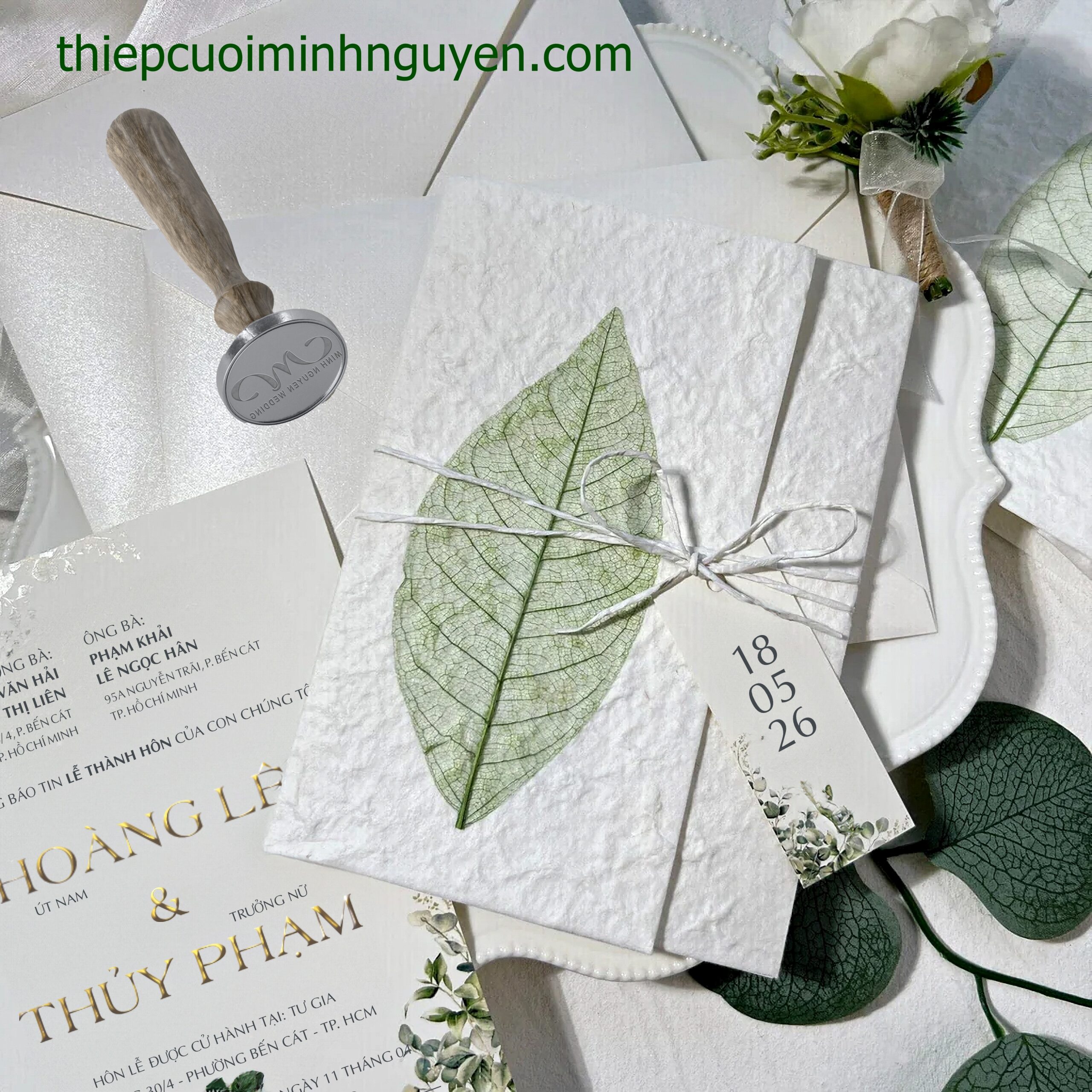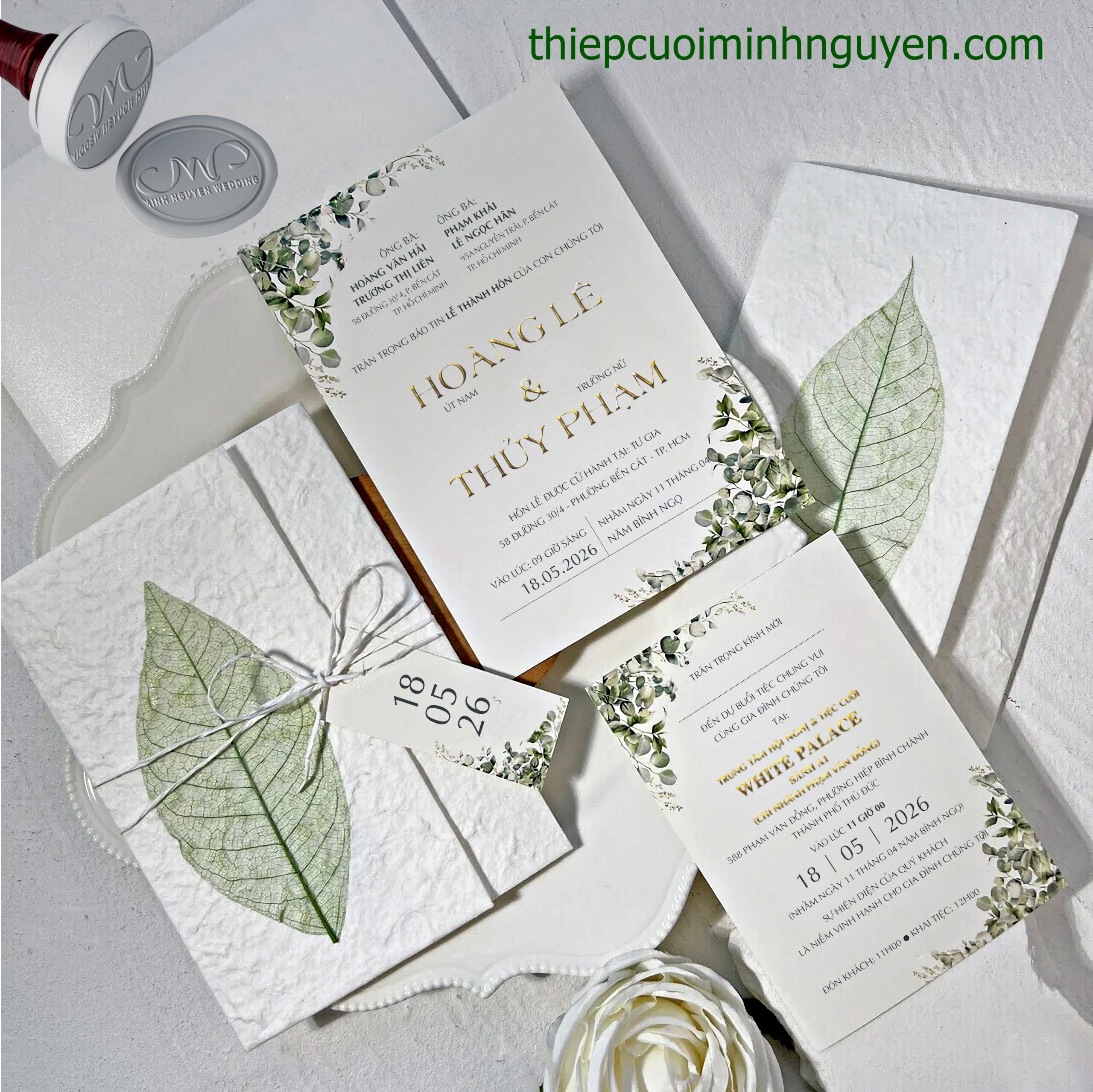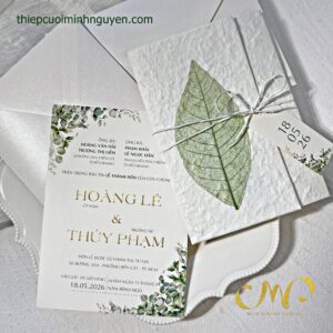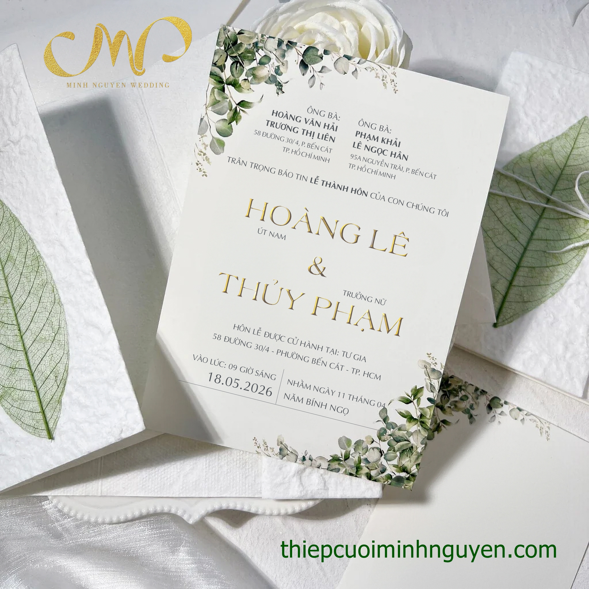 – Tờ thiệp mời: 12cm x 18cm….(option), in 1 mặt – giấy mỹ thuật tiêu chuẩn định lượng 250gsm
