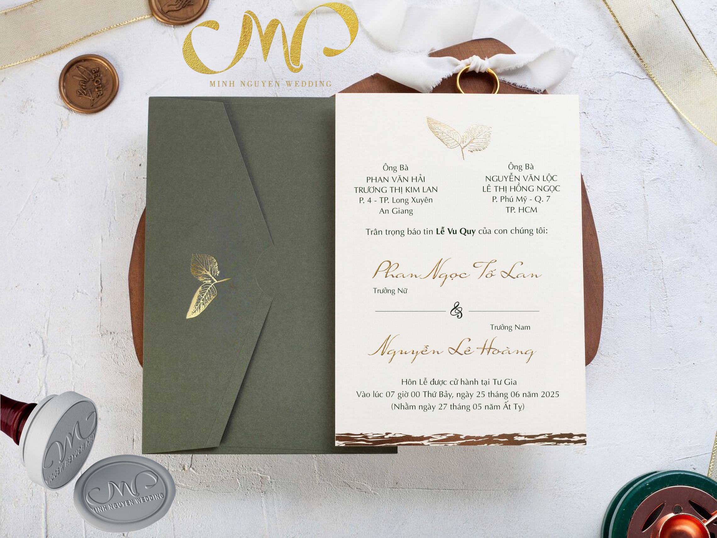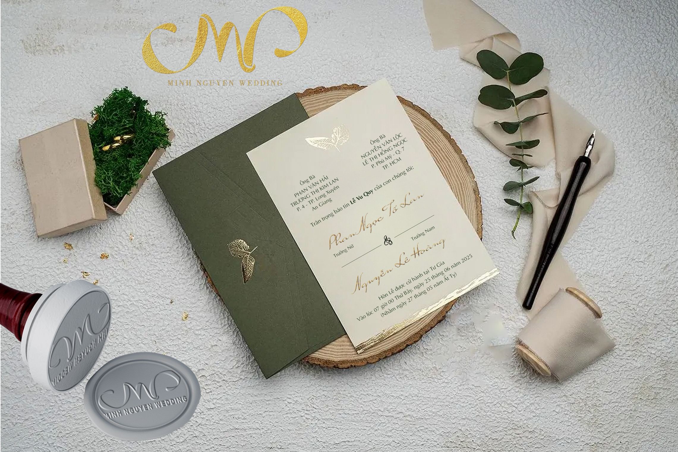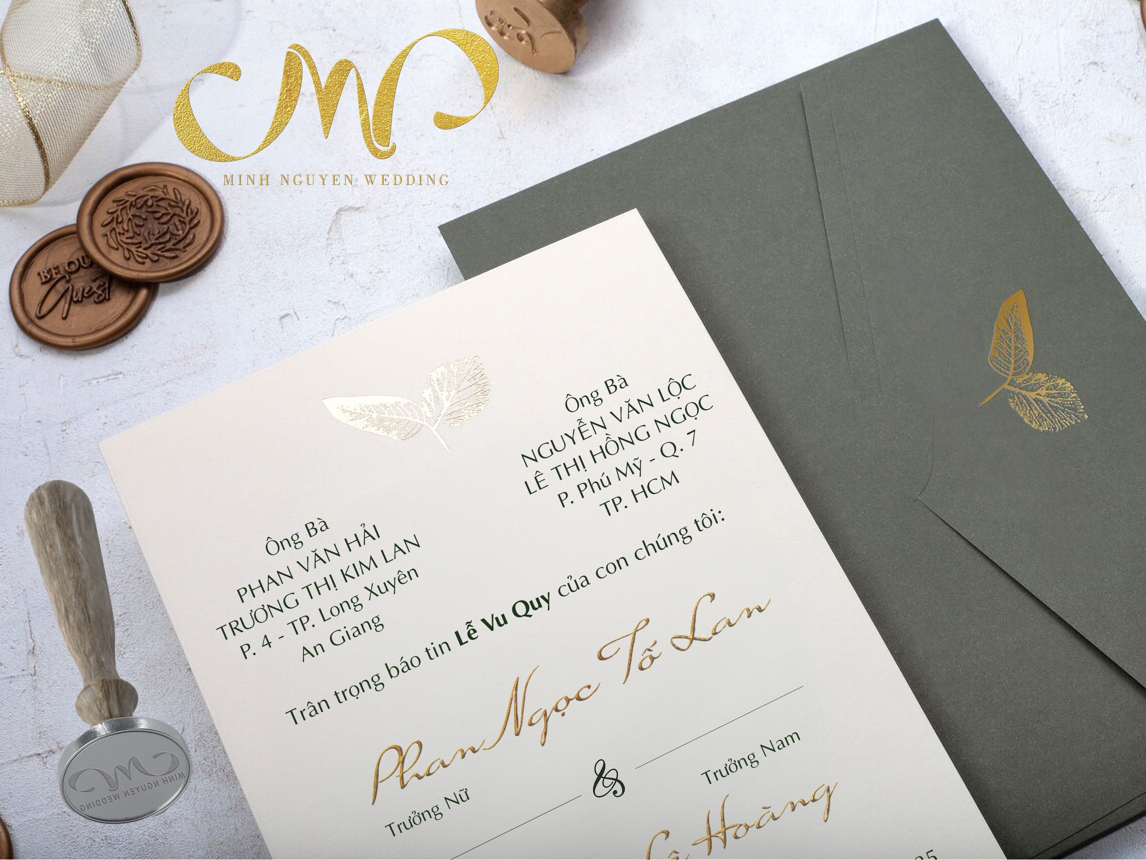 – Gia tăng sự sang trọng, ấn tượng bằng công nghệ: ép kim nổi 2D – 3D, dập chìm, bế nổi chữ/ hoa văn 2D- 3D, khắc laser, bồi dày, trang trí thêm wax seal, nơ các loại, …tất cả được thực hiện ngay tại TCMN (tham quan)