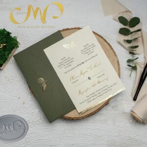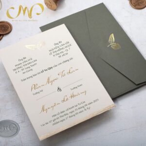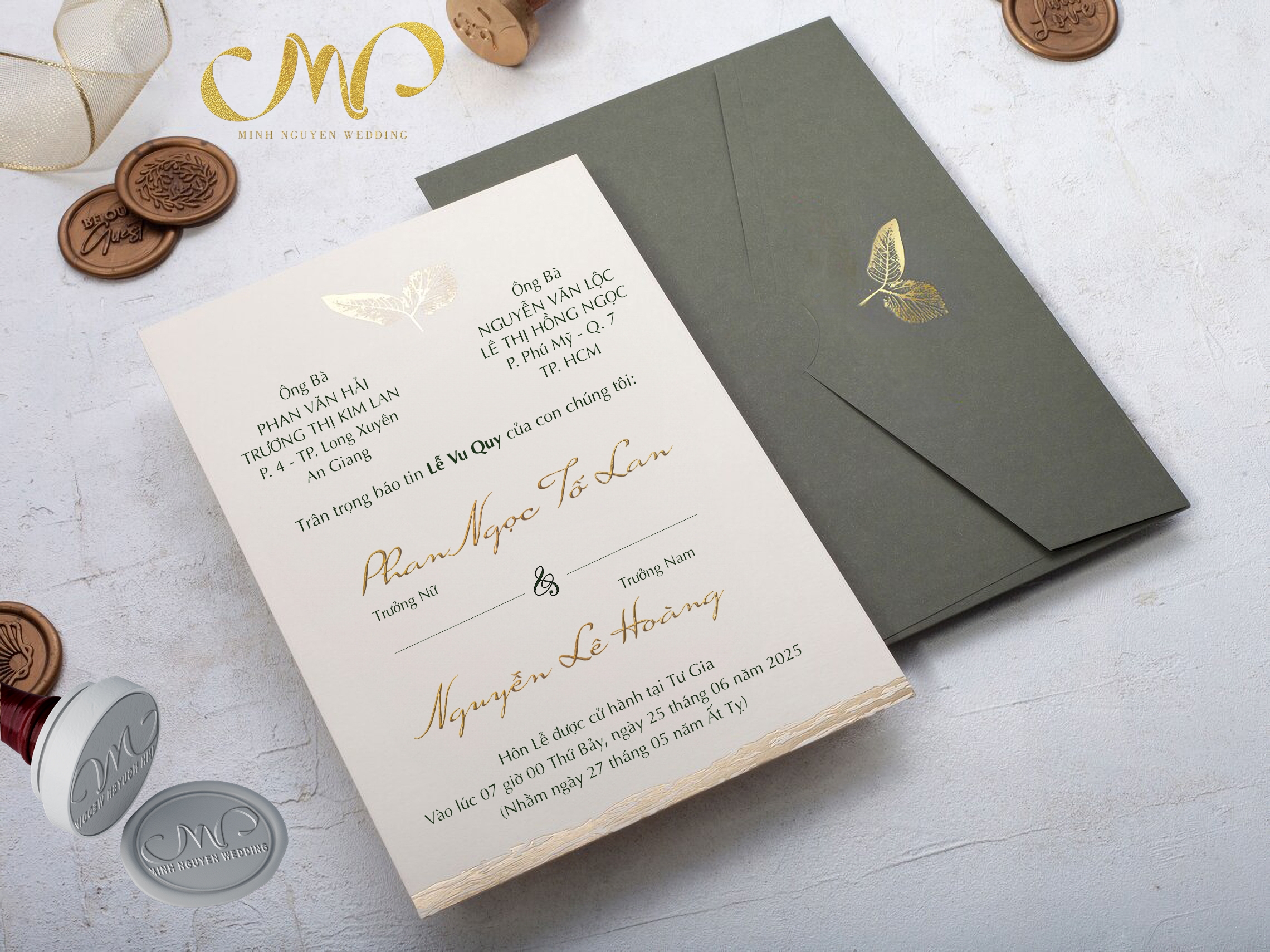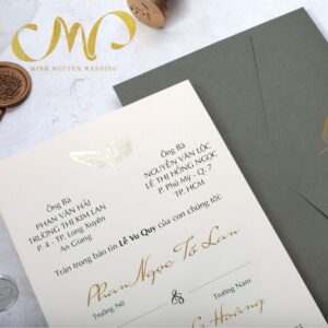 – Tờ thiệp mời: 12cm x 18cm….(option), in 1 mặt – giấy mỹ thuật tiêu chuẩn định lượng 250gsm