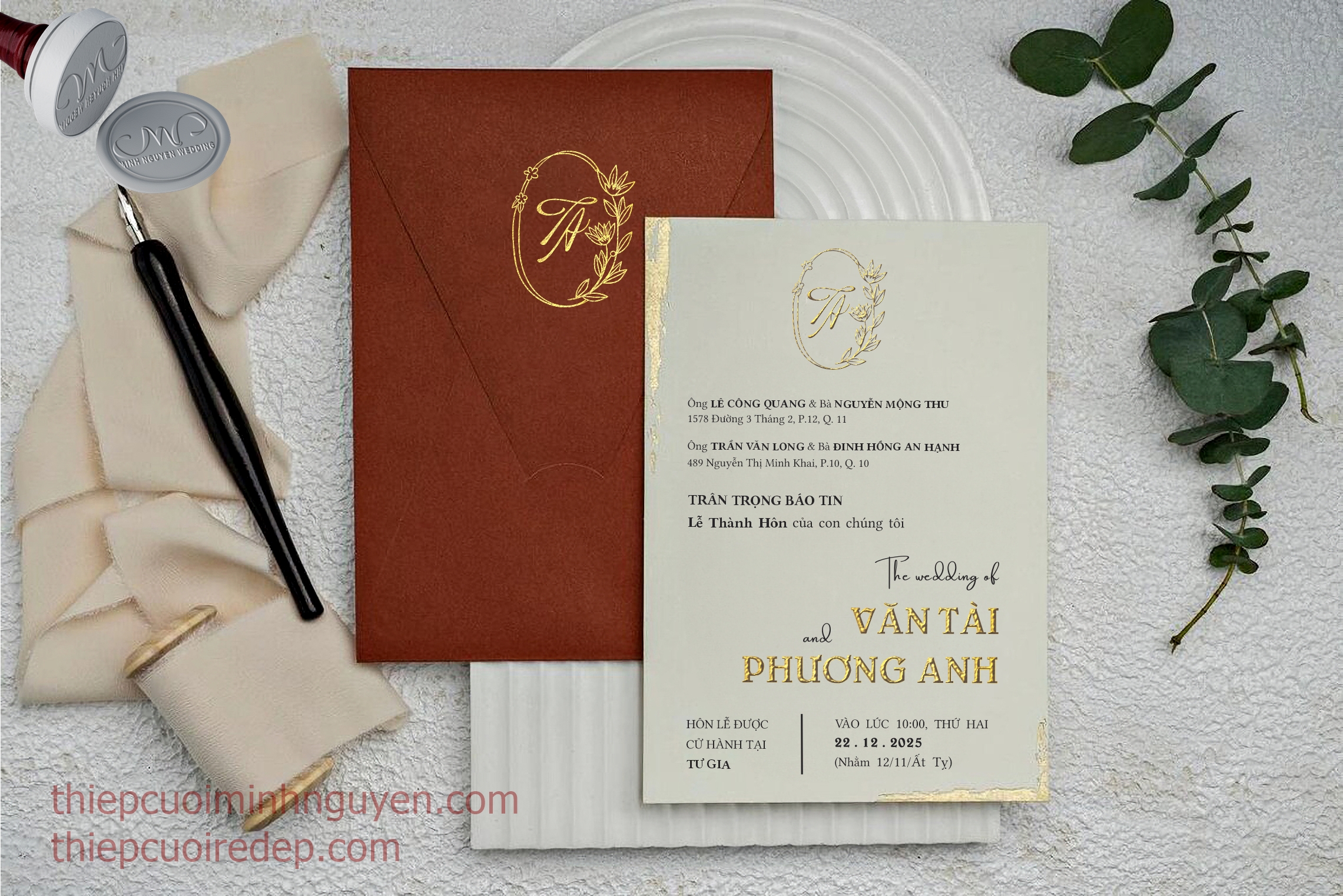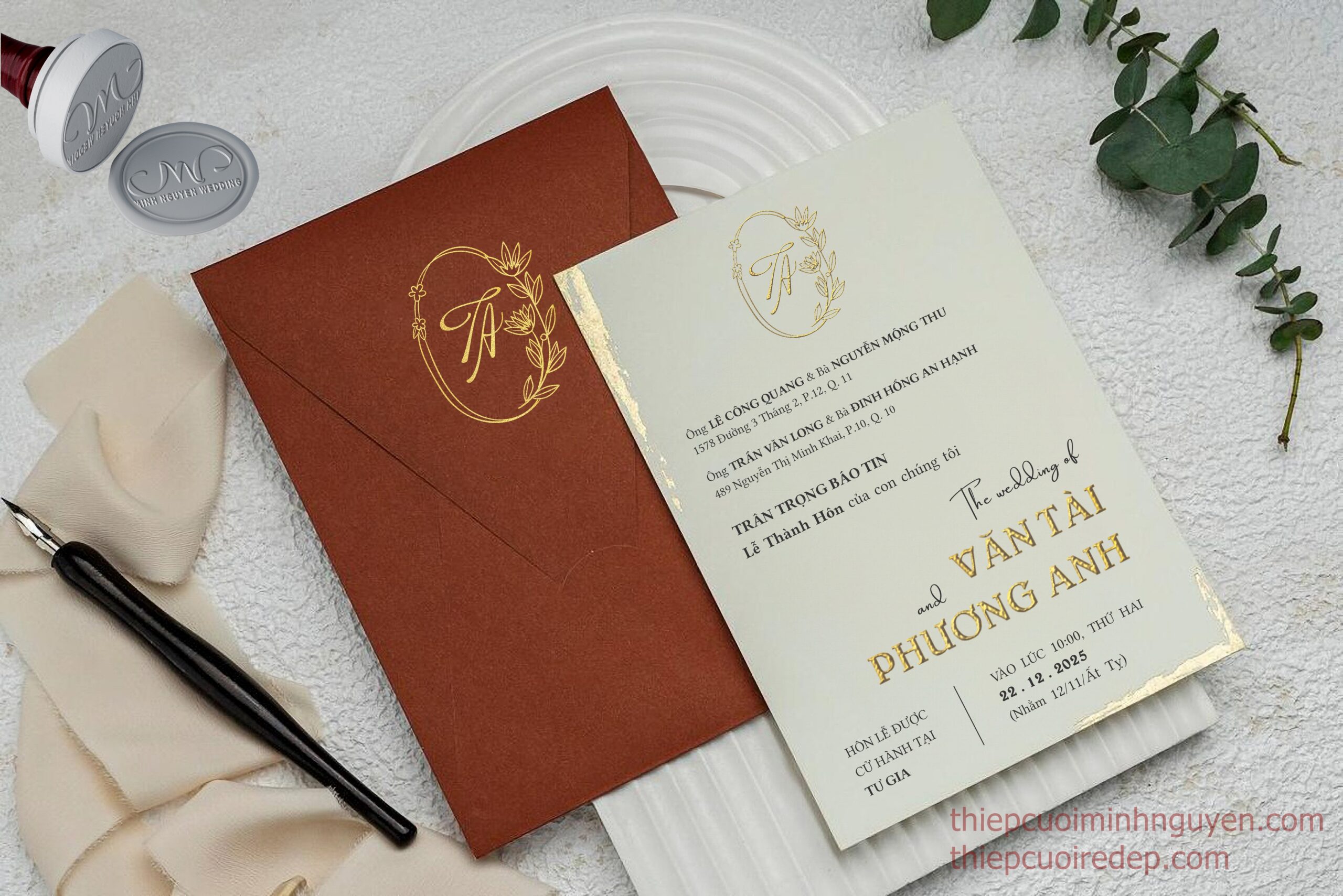 – Gia tăng sự sang trọng, ấn tượng bằng công nghệ: ép kim nổi 2D – 3D, dập chìm, bế nổi chữ/ hoa văn 2D- 3D, khắc laser, bồi dày, trang trí thêm wax seal, nơ các loại, …tất cả được thực hiện ngay tại TCMN (tham quan)